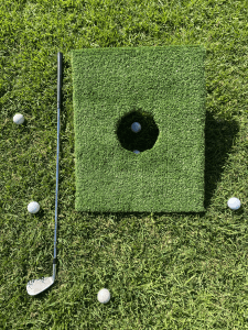 The game consists of golf clubs, golf balls, a flag (or a hole-in-a-board surface) and artificial turf to hit from.