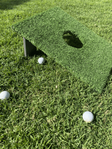 The players will hit a golf ball from the artificial turf, known as the tee, to the flag/hole.
